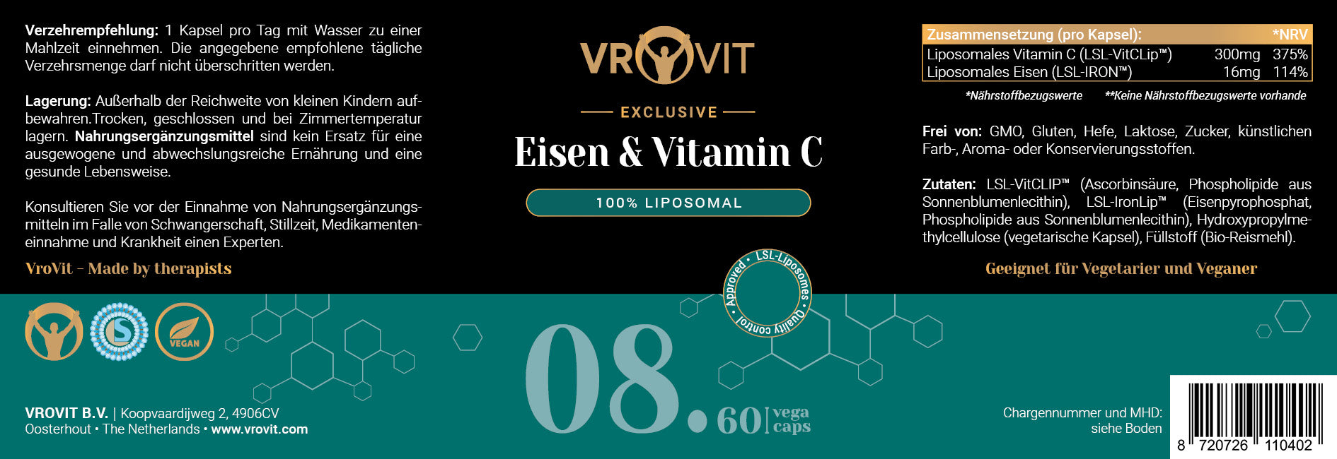 VROVIT No. 8 Liposomales Eisen & Vitamin C überzeugt durch eine außergewöhnlich hohe Bioverfügbarkeit – dank modernster LSL-Liposomentechnologie. Die liposomale Verkapselung der Wirkstoffe sorgt für eine verbesserte Aufnahme im Körper und eine effektive Versorgung auf Zellebene. Jede Kapsel enthält 400 mg LSL-VitCLip™ (Vitamin C) sowie 16 mg LSL-Iron™ (Eisen) – optimal dosiert für eine aktive Unterstützung im Alltag.