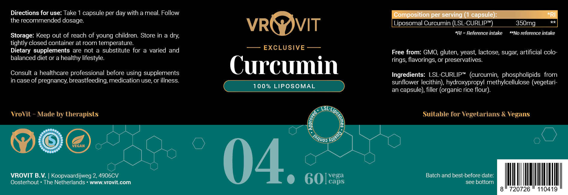 Curcumin is known for its anti-inflammatory and protective properties. But did you know that regular curcumin is barely absorbed by your body? VROVIT No.4 solves this with liposomal technology – for much better absorption.